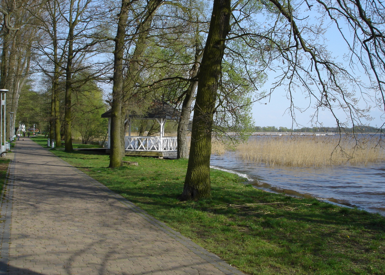 Promenada nad jeziorem Miedwie ma około kilometra długości i ciągnie się wzdłuż brzegu w Morzyczynie, stopniowo przechodząc z otwartej, nasłonecznionej przestrzeni w bardziej zacienione fragmenty przy lesie olchowym. Spacer zaczyna się zwykle w okolicach plaży i amfiteatru, gdzie nad wodą widać charakterystyczny żaglowy dach i szerokie schody, a dalej ścieżka łagodnie prowadzi w stronę drewnianych pomostów. Idąc po równym, szerokim chodniku, co kilka kroków napotyka się wmurowane w nawierzchnię mosiężne tabliczki – to niewielkie plansze z ciekawostkami o lokalnej florze i faunie, które od razu nadają temu miejscu charakter ścieżki edukacyjnej. W oczy rzucają się też liczne ławki, pergole z pnączami i niewysokie balustrady, dzięki którym nic nie zasłania widoku na taflę Miedwia. Całość jest oświetlona, więc po zmroku nie ma poczucia odcięcia od cywilizacji – promenada zachowuje wtedy spokojny, ale wciąż miejski klimat, tyle że z wodą dosłownie na wyciągnięcie ręki.